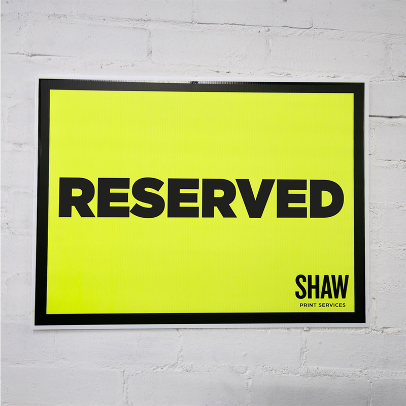 All of our standard signs feature a small Shaw Print Services logo in the corner and are sold individually with no minimum order or screen charge.
